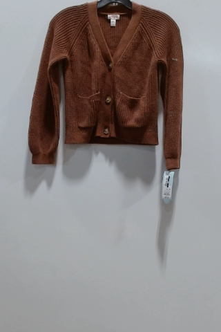 This stylish cardigan from Cat & Jack is a must-have for any fashionable girl. The brown ribbed knit fabric offers both comfort and style. It features a classic button-up design and two front pockets. This sweater is a size medium, perfect for layering or wearing on its own during cooler days.